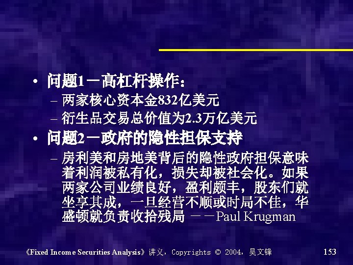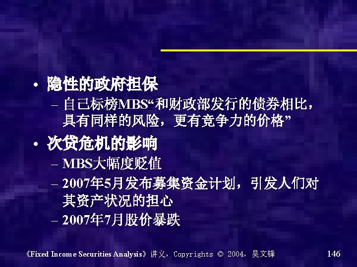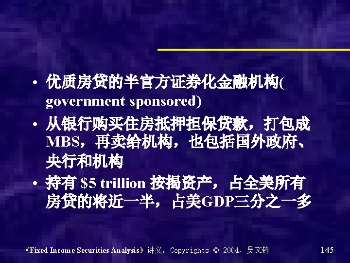 Government Sponsored Entities • 由政府主办机构,基本上也没有信用风险 • 比如:Fannie Mae “房地美” –联邦国民按揭协会(Federal National Mortgage Association) • Freddie Mac “房利美” –联邦家庭贷款银行(Federal Home Loan Bank Corporation • Sallie Mae “萨利美” –学生贷款营销协会(Student Loan Marketing) 《Fixed Income Securities Analysis》讲义,Copyrights © 2004,吴文锋 142