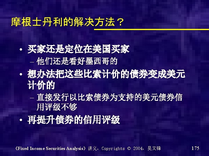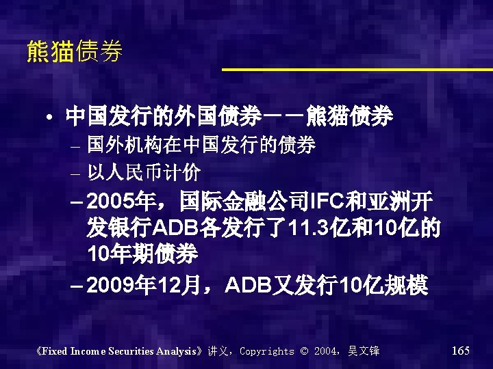 外国债券 • 外国债券 foreign bonds – 非本国发行主体发行,但在本地市场发行 和交易 – Denominated in any currency(一般 为发行国货币) – Privately placed or publicly issued – Yankee bonds (US),Samurai(Japan), Bullgod bonds( UK) – 中国的呢? 《Fixed Income Securities Analysis》讲义,Copyrights © 2004,吴文锋 164