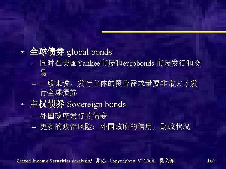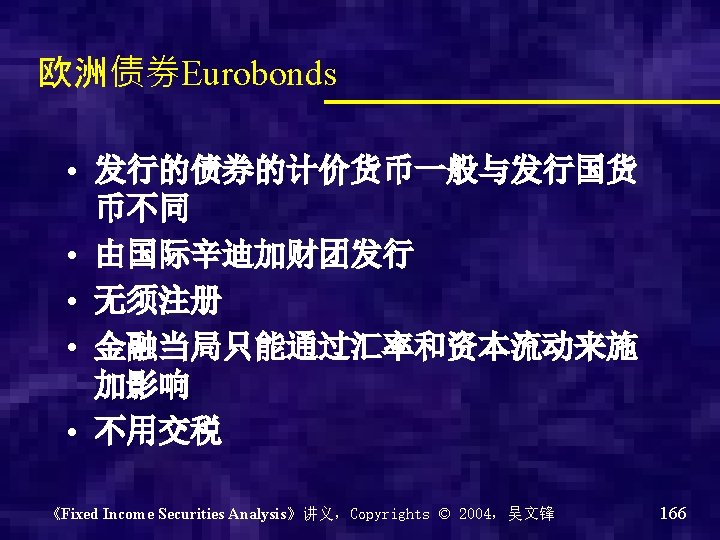 国际债券 • 外国债券 foreign bonds • 欧洲债券Eurobond 《Fixed Income Securities Analysis》讲义,Copyrights © 2004,吴文锋 163