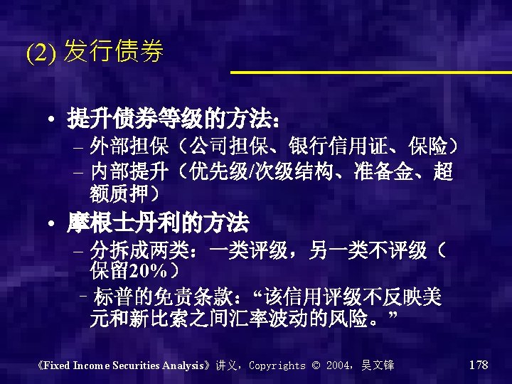 Corporate Bonds • Secured debt – Financial assets – Personal property – Real property • Unsecured debt – Debenture bonds 信用债 – Subordinated debentures 次级债 《Fixed Income Securities Analysis》讲义,Copyrights © 2004,吴文锋 159
