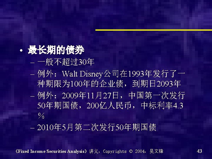2、期限 • 期限( Maturity ) – Term to maturity – 到期日:maturity date • 根据期限的分类 – 短期债券 (short-term): 5年以下 – 中期债券 (intermediate): 5-12年 – 长期债券 (long): 12年以上 《Fixed Income Securities Analysis》讲义,Copyrights © 2004,吴文锋 42