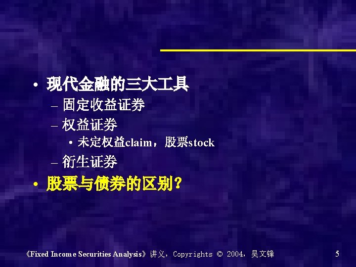 What is Fixed Income Security • 指在未来指定时间支付事先固定数量现 金的金融产品 • 种类 – 债券--俗称 – 优先股preferred stock – 银行贷款bank loans 《Fixed Income Securities Analysis》讲义,Copyrights © 2004,吴文锋 4