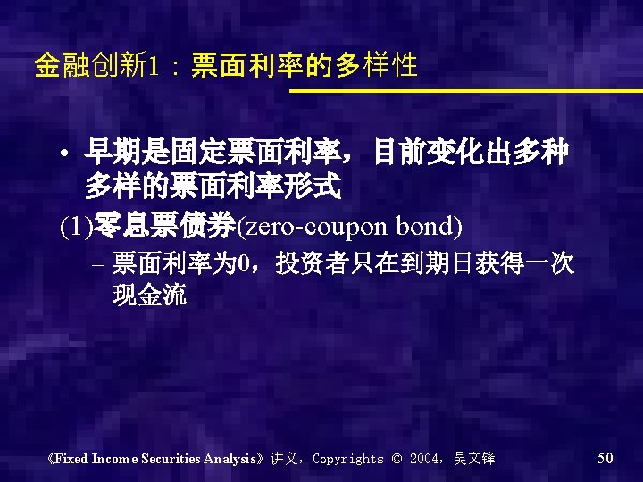 6、息票利率 • 息票利率、票面利率(coupon rate) – 名义利率(nominal rate) • 息票利息额 (coupon) – Coupon = coupon rate * par value • 比如: 02三年期电网建设债, – Coupon rate = 3. 50% – Par value = 1000 – 利息额=3. 50%*1000 = 35 《Fixed Income Securities Analysis》讲义,Copyrights © 2004,吴文锋 49