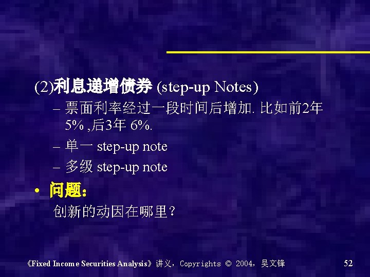 (4)浮动利率债券 (floating-rate securities) – 票面利率是浮动变化的 – 典型的票面利率公式: Coupon rate (Cr) = reference rate + quoted margin – 参见“ 04蒙电债”发行概要 – Reference rate:参考利率、基准利率 – Quoted margin:利差 • 创新的动因? 《Fixed Income Securities Analysis》讲义,Copyrights © 2004,吴文锋 54