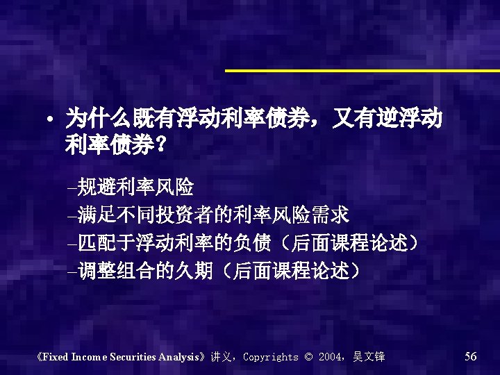 浮动利率的变种 • 杠杆化/去杠杆化浮动利率 Deleveraged /leveraged floater = b × reference rate + quoted margin b is constant • 逆浮动利率 Inverse floater = constant rate (k) – L × reference rate L is the multiplier 《Fixed Income Securities Analysis》讲义,Copyrights © 2004,吴文锋 55