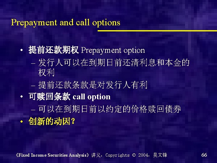 Importance of Embedded Options • Affect the timing of cash flows • Forecasting interest rates • Affect performance over time 《Fixed Income Securities Analysis》讲义,Copyrights © 2004,吴文锋 65