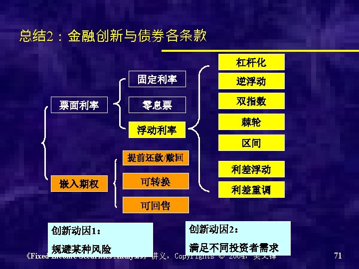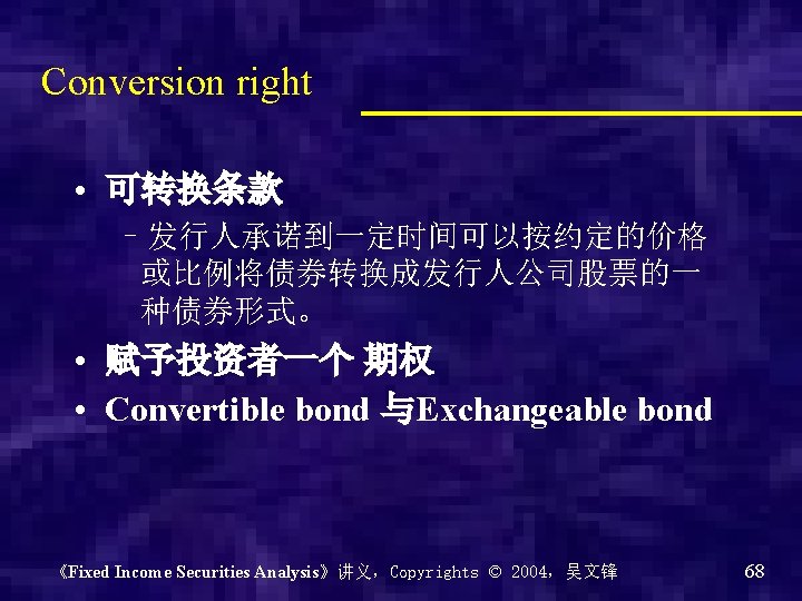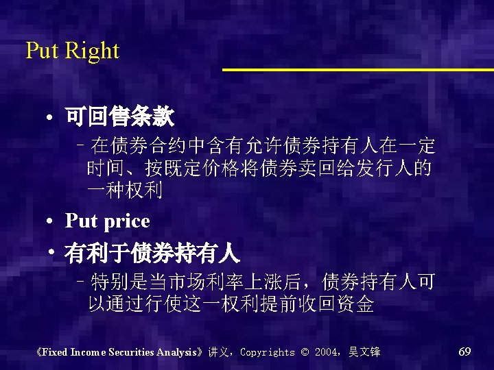 8、金融创新 2:嵌入期权条款 Embedded Options 1. Prepayment option and call option 2. Conversion rights 3. Put provision 《Fixed Income Securities Analysis》讲义,Copyrights © 2004,吴文锋 64