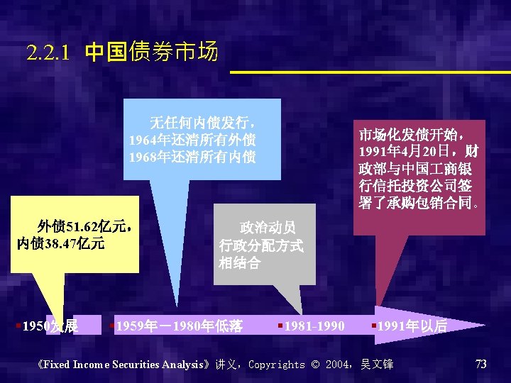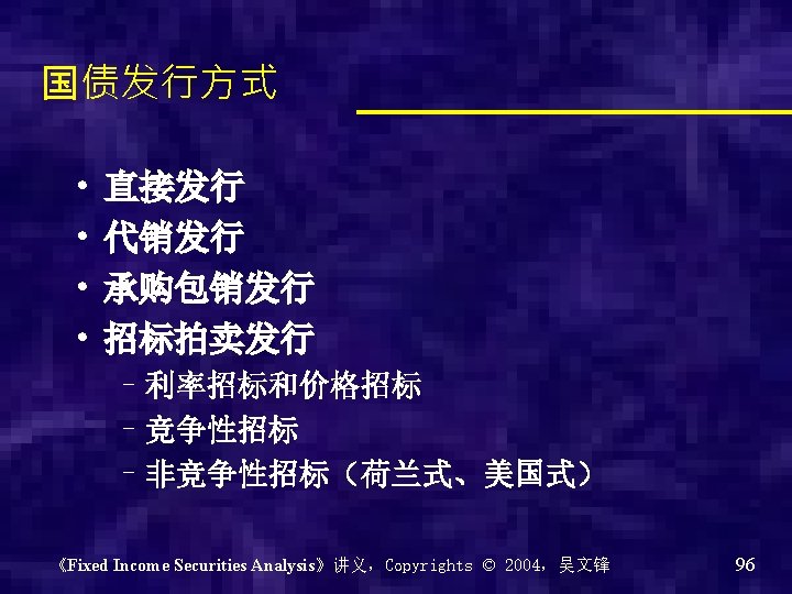 中国国债发行量 1993 -2000 1年<期限 3年<期限 ≤ 3年 ≤ 7年 期限≤ 1年 7年<期限 年份 ��� 息 附息 到期一次� 本付息 2000 0 2119. 5 400 200 999. 5 1120 1999 0 2312 0 0 612 620 1080 1998 0 5860. 2 3 0 0 0 540 5320. 23 1997 213. 8 130 0 0 213. 8 0 130 1996 701. 34 465 0 701. 34 0 209. 7 255. 3 1995 0 0 118. 89 0 0 0 1994 0 0 132. 63 0 0 0 1993 0 15. 23 0 0 0 15. 23 0 《Fixed Income Securities Analysis》讲义,Copyrights © 2004,吴文锋 95