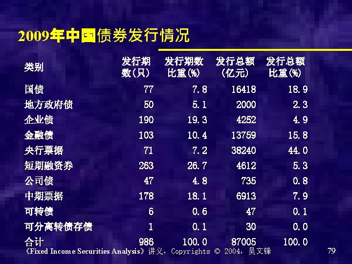 2008年中国债券发行情况 类别 发行期数(只 发行总额(亿元) 发行总额比重(%) ) 国债 36 7965. 00 10. 99 企业债 71 2366. 90 3. 27 金融债 87 11797. 30 16. 28 央行票据 122 42960. 00 59. 28 短期融资券 270 4344. 00 5. 99 证券化资产 26 302. 01 0. 42 公司债 15 288. 00 0. 40 中期票据 41 1737. 00 2. 40 可转债 5 77. 20 0. 11 可分离转债存债 11 632. 85 0. 87 《Fixed Income Securities Analysis》讲义,Copyrights © 2004,吴文锋 合计 684 72470. 26 100. 00 78