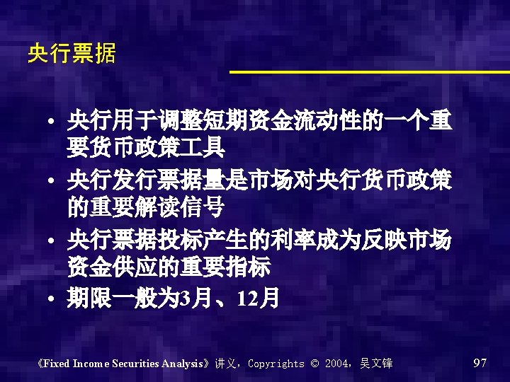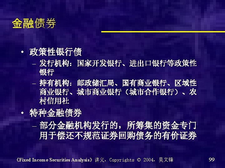 举例 期限( 发行价 月) 格(元) 发行总量 (亿元) 息票品 种 利率/ 参考收 益率 (%) 名称 发行日期 招标方式 06央行票据 88 20061130 价格招标 3 99. 39 10 贴现 2. 4617 06央行票据 87 20061128 数量招标 12 97. 28 100 贴现 2. 7961 06央行票据 86 20061121 价格招标 12 97. 26 20 贴现 2. 8172 06央行票据 85 20061116 价格招标 3 99. 38 30 贴现 2. 5023 06央行票据 84 20061114 价格招标 12 97. 29 100 贴现 2. 7855 06央行票据 83 20061109 价格招标 3 99. 38 200 贴现 2. 5023 06央行票据 82 20061107 价格招标 12 97. 29 100 贴现 2. 7855 06央行票据 81 20061102 价格招标 3 99. 38 250 贴现 2. 5023 《Fixed Income Securities Analysis》讲义,Copyrights © 2004,吴文锋 98