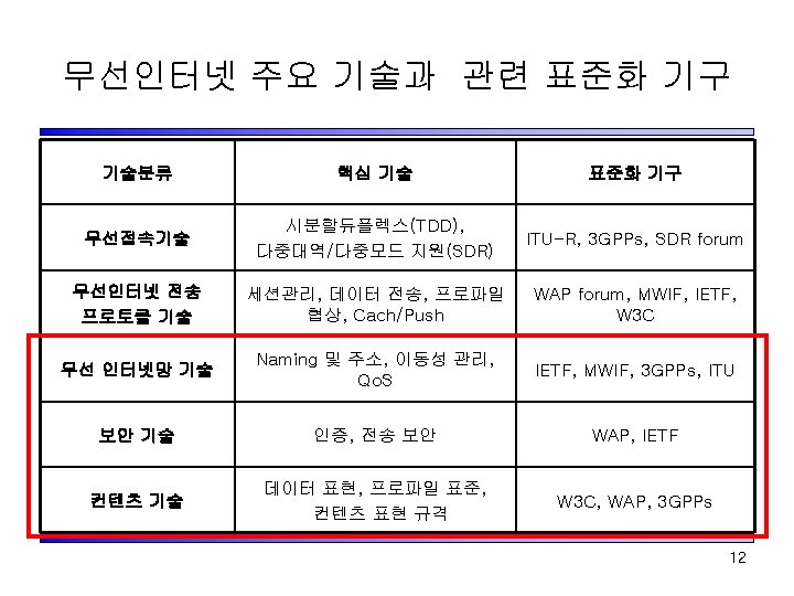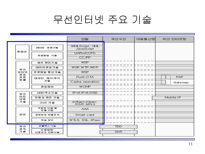 All IP 표준화 Drivers PREEMINIENT GROUPS : VISION & HARMONIZATION Vision politics ITU-T IMT 2000 -SSG technology 3 G. IP 3 GPP <R 99 initiative> Global roaming harmonization Interoperability commonality market OHG 3 GPP 2 All-IP Standard <Active for Evolution> REGIONAL STANDARDS: STANDARD SYSTEM DESIGN & EVOLUTION TECHNICAL INITATIVES: stage 2/3 ETSI/ BRAIN MARKET DRIVERS: stage 0/1 requirements DEFACTO STANDARDS: stage 2/3 protocols UMTSF GSM Mo. U IETF ATMF SYSTEM ENGINEERING : stage 1/2 requirements MWIF CDG FORUMS & MARKET REPRESENTATIVES : LEADING STADARDIZATION TREND 10