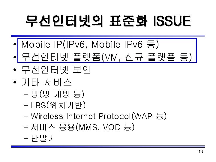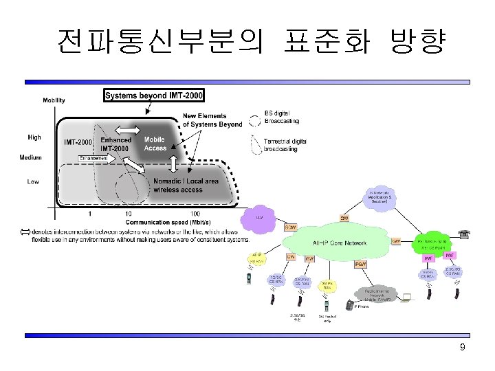 무선 인터넷 관련 표준화 기구 • ITU(International Telecommunication Union) – ITU-R(Radio Communication Sector) – ITU-T(Telecommunication Standardization Sector) • 3 GPP(3 rd Generation Partnership Project ) & 3 GPP 2(3 rd Generation Partnership Project 2) – MWIF, IPv 6 forum … • ISOC(Internet SOCitey) – IETF(Internet Engineering Task Force) 8
