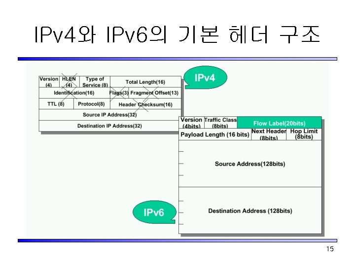 IPv 6(Internet Protocol, Version 6) • 128 bit 주소체계를 가지는 Internet Protocol • 특징 – – – • 확장된 주소체계 강한 IP-layer Privacy와 authentication Flow label 효율적, robust mobility 구조 Server-less 자동 configuration(plugn-play)와 reconfiguration(renumbering) Streamlined header format 응용범위 – – – 무선인터넷(이동성 및 개인화, 안정성, Mobility, Personality, Security) 홈네트워크, 정보가전(확장성, 품질성, Scalability, Quality) 망관리(Easy Management) 14