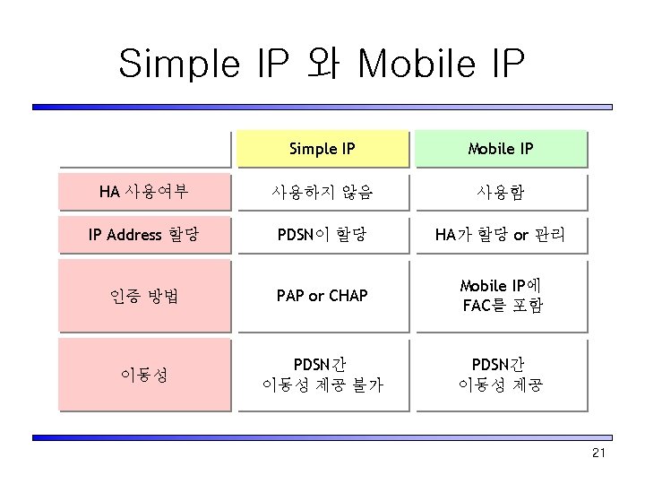 Terminology for Mobile IP • Mobile IPv 4 – Mobility을 지원하는 IPv 4 계열의 Internet Protocol (RFC 2002에 정의) • Mobile IPv 6 – Mobility을 지원하는 IPv 6 계열의 Internet Protocol • Mobility Agent – Home Agent(HA) : mobile node의 Home network 상에 있는 라 우터 – Foreign Agent(FA) : mobile node가 방문하는 network 상에 있는 라우터 • Mobile Binding – Home address와 Care-of-address(COA)의 association • Mobility Network – 고정 Node, Mobile 노드 또는 라우터가 연결되어 Mobile 라우터 지원을 받는 Network 20