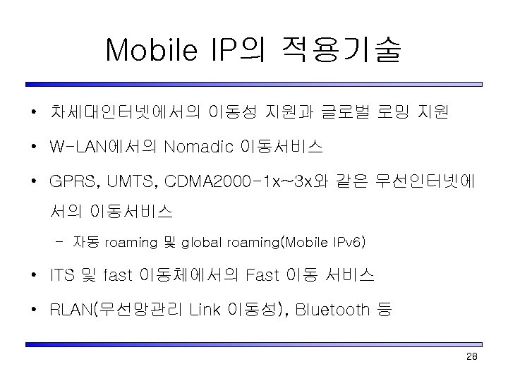 Mo. IP Based Micro Mobility Management protocol in the 3 G Network • 3 G cdma 2000 네트웍에서 RAN과 Packet Data Network간 Mobility를 지원하기 위하여 Mo. IPv 4 (IETF RFC 2002)에 추가적인 Message와 Extension 정의 • Mo. IPv 6에서는 FA의 기능이 필요 없지만 Mo. IPv 6 Handoff 지원을 위한 중심 Point는 필요 • Micro Mobility – 무선망에서의 기지국 단위 또는 페이징 단위의 위 치이동성 제어 • Mo. IP의 HA, FA 간 이동성 제어는 수행 안함 • 빠른 H/O 처리 27