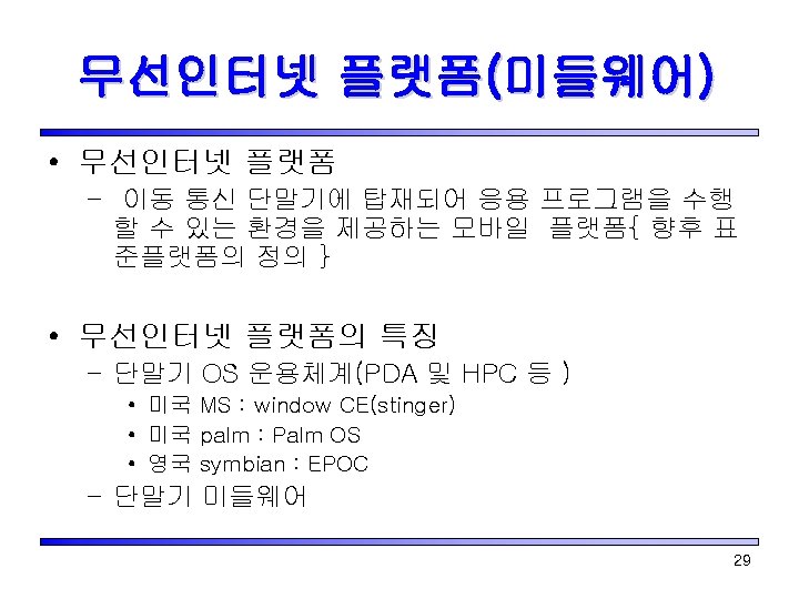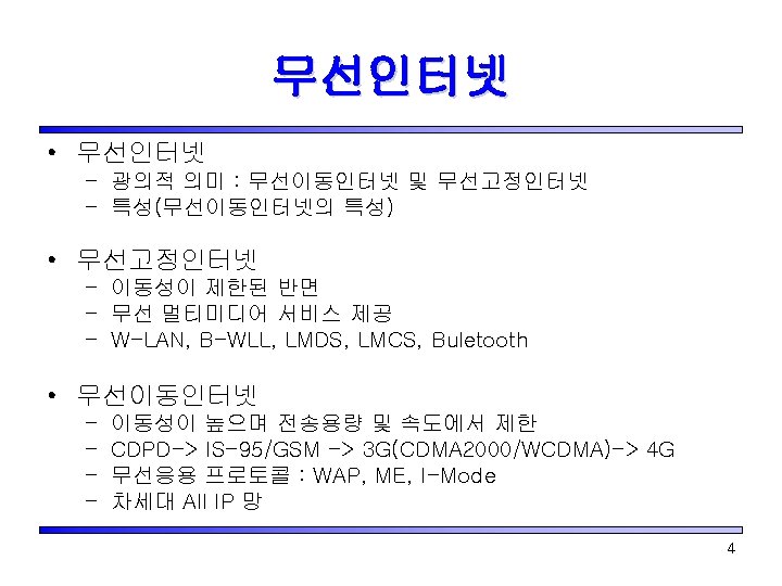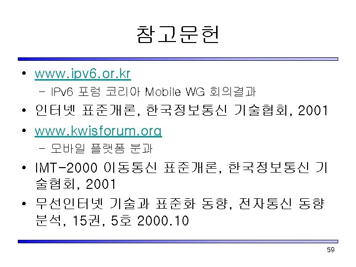 무선인터넷 프로토콜 표준 • 응용프로토콜 분과 – EFI(External Functionality I/F) 기술 표준 – Sync. ML 기술 표준 • 접속 프로토콜 – WAP(Wireless Application Protocol) – I-mode – Mobile Explorer 57