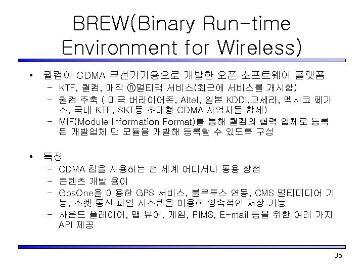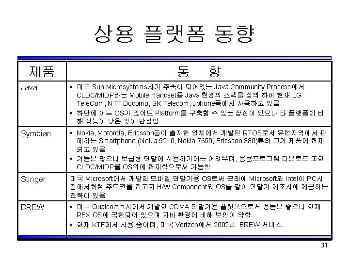 무선인터넷 플랫폼 기술동향 • 지원언어에 따른 분류 – Java(Mobile Java) : JAVA VM, SK-VM(XVM), Symbian – C, C++ : GVM, MAP, BREW, Stinger, Windows CE • 수행방법에 따른 분류 – Interpreter 방식(Virtual Machine : VM) • • Java VM KVM GVM(General Virtual Machine) XVM, SKVM – Binary 방식(Native 방식) • BREW • MAP 30