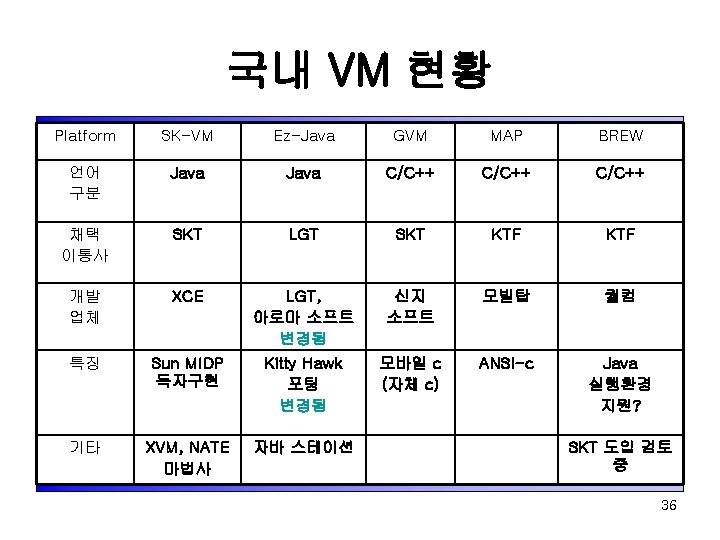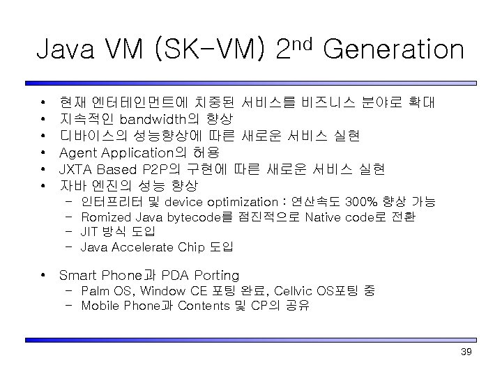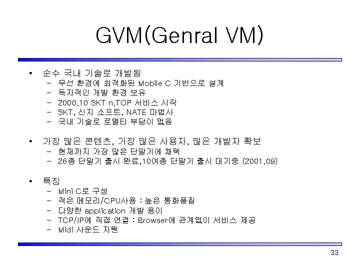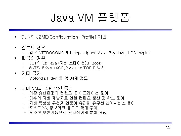 Japan의 Mobile Java VM 사업자 Do. Co. Mo J-Phone KDDI(au) Service Name i-Appli J-Sky Java ezplus Configuration CLDC Profile Doja Feature HTTP/HTTPS Low level Graphic MIDP+JSCL (J-PHONE Specific Class Library) 2 D Sprite 3 D Polygon 디바이스의 내부정보 사용 방법 Not allowed by JSCL by Extension program size 10 k 30 k 50 k download site official/ unofficial download speed 9. 6 kbps 9. 6 Kbps 14. 4 kbps MIDP+ KDDI Profiles CMAIL Jumon 37