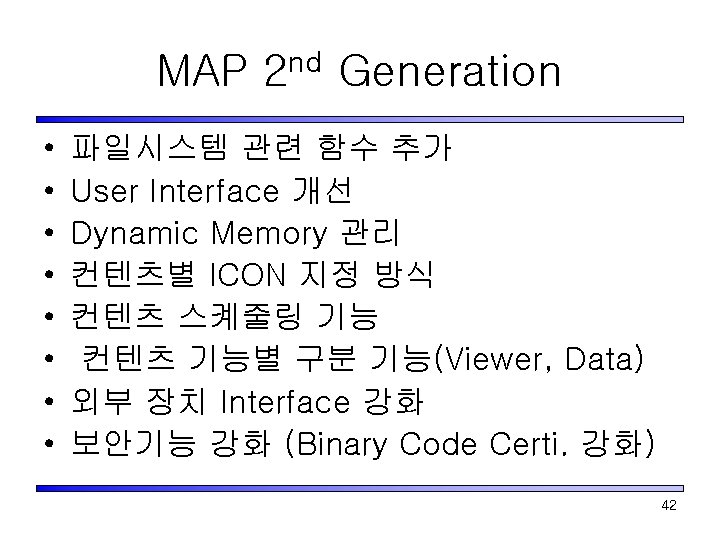 GVM 2 nd Generation • GVM 3 X 방향 – 단말기 HW 발전 대응 – Mobile C의 각종 제한규격 완화 – Application 레벨의 차별화 된 기능 추가 • 주요 변경 규격 – – Application Size 및 각종 Buffer 확대 Agent Running Mode 추가 Network, Graphic Library 기능 개선 Filesystem, Multimedia 연동기능 추가 41