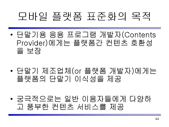 BREW 2 nd Generation • • SMS -> MMS Bluetooth 탑재 Web Browser Components : 기능추가 Image Viewer 보완 CMX 2. 2 Interface 강화 Voice Services 강화 Graphics 기능 강화 Security: SSL등 기능 강화 43