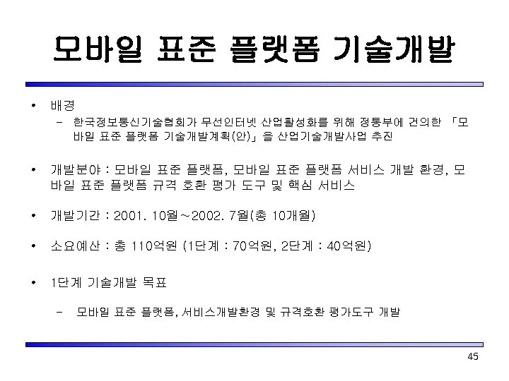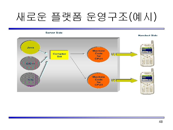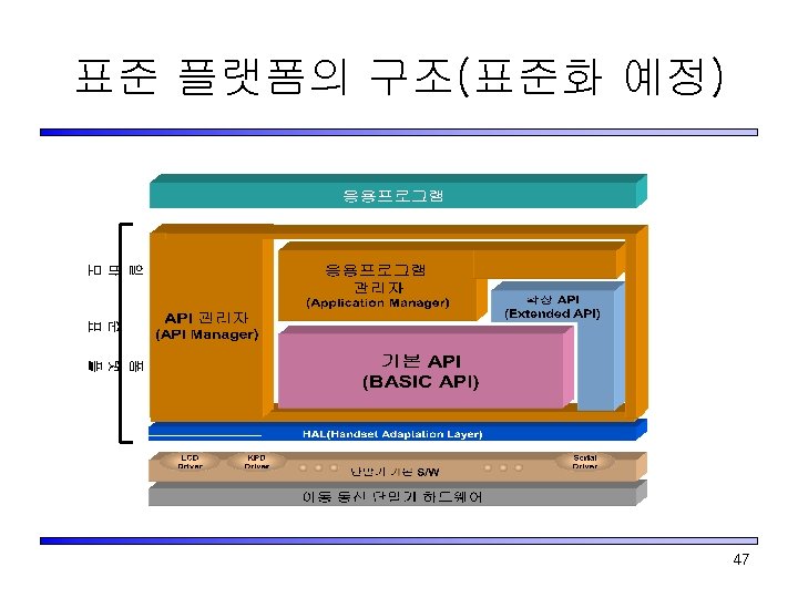 Platform 표준화 Scope(표준화 예정) 지원 언어 중간경로 Application In C/C++ 머신 코드 API BASIC API Native S/W 단말기 기본 S/W Engine HAL (Qualcomm Route Application In Java Engine 의 경우 DMSS) H/W Handset Device Hardware Extended API 46