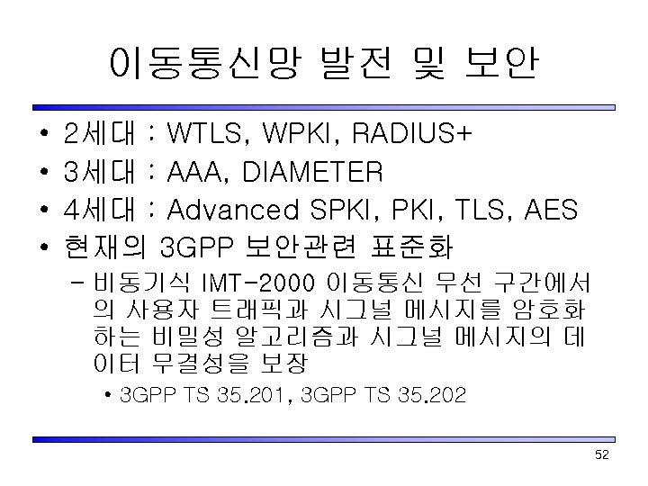 무선인터넷 보안 • 보안 특성 – 비밀성(Confidentiality) – 인증(Authentication) – 허가(Authorization) 및 접근제어(Access Control) – 개인상황(Privacy) 및 익명성(Anonymity) – 서비스 가용성(Service Availability) – 이벤트 제한(Event Limiting) – 이벤트 보고(Event Reporting) 51