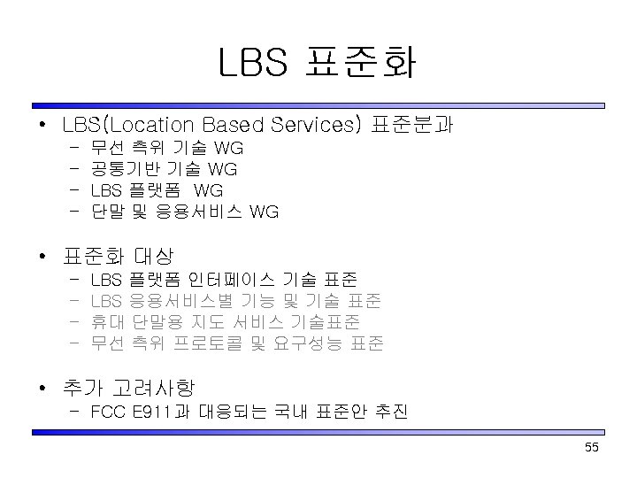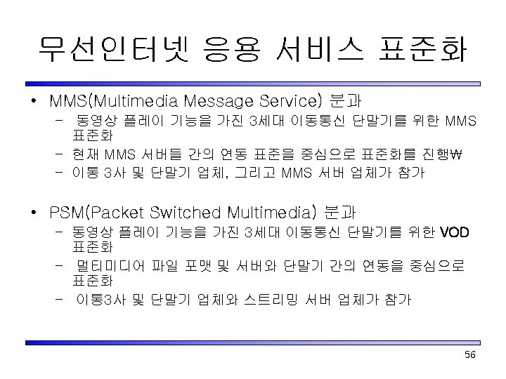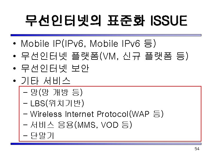 무선인터넷 표준화 포럼내의 표준화 Multimedia Messaging 무선통신 사업자 Increase ARPU with new Value-added services Streaming Video Location Based Services Multiplayer Gaming Infrastructure Content Provider Take advantage of new service infrastructure to provide compelling contents to the subscribers 53