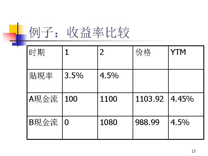 Do not use yield curve to price bonds n n n They can not be priced by discounting cash flow with the same yield because of different structure of CF. The Principle of No Arbitrage or The Law of One Price Use spot rates (yield on zero-coupon Treasuries) instead! 12