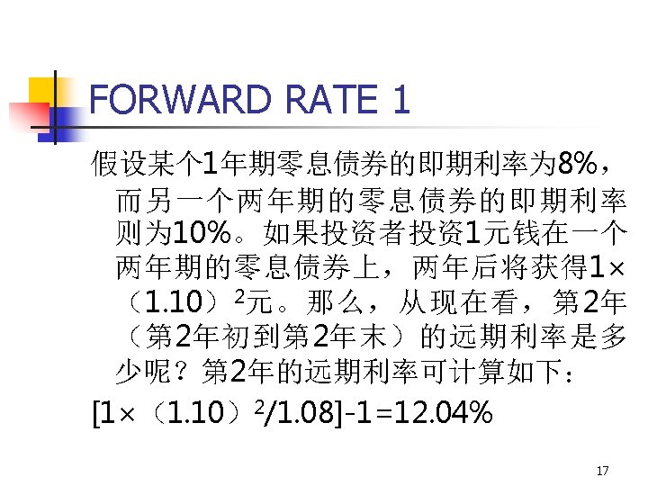 FORWARD RATE n DEFINITION: the interest rate today that will be paid on money to be n n n borrowed at some specific future date and to be repaid at a specific more distant future date 远期利率是指从未来某个日期开始的远期债 务合约所要求的利率。 16