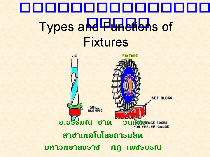 เอกสารอางอง Jigs and Fixtures Design Second Edition, EDWARD G. HOFFMAN Chapter 26 Jigs and Fixtures www. accd. edu/sac/engtech/CADD/Rstrube/TECHNCAL_DRAFTING/Stud ent%20 Tutorial%20 Power%20 Points/CH. 26 PPT