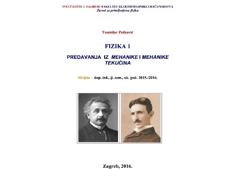 PREDAVANJA iz FIZIKE Temelje se na stvarnim pokusima (eksperimentalna metoda na predavanjima) i višoj matematičkoj analizi, pogotovo za moderne tehničke fakultete. Studij fizike ima tako nužno egzaktni karakter, koji se ne može nadomjestiti samoučenjem! LITERATURA: 1. T. Petković, FIZIKA 1 PREDAVANJA IZ MEHANIKE i MEHANIKE TEKUĆINA, Skripta dop. izdanje, ak. god. 2015. /2016. , FER, Zagreb 2016. 2. T. Petković, UVOD U ZNANOST O TOPLINI I TERMODINAMICI, 2. dop. izd. Element, Zagreb, 2016. Udžbenik fizike za studente FER-a i SEUi. OI u Šibeniku.
