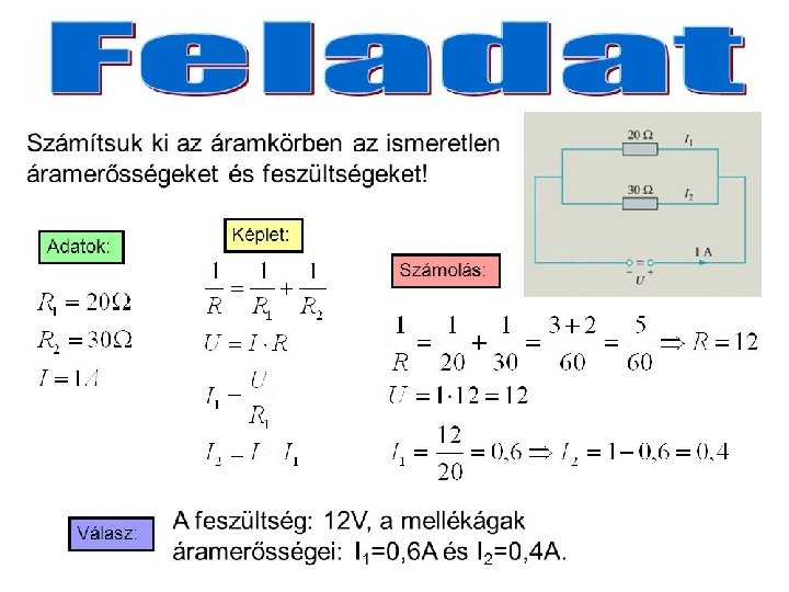 Megoldási algoritmus 1. Annak eldöntése, hogy egyszerű soros, párhuzamos, vegyes vagy összetett, többhurkos hálózatról van-e szó? 2. Ha egyszerű az áramkör: El lehet-e indulni az Ohm-törvény segítségével, azaz van-e olyan áramköri elem, ahol az U, R, I adatokból 2 adott? 3. El lehet-e indulni soros, párhuzamos ellenállások helyettesítésével? 4. Lehet-e folytatni 2, 3 pont valamelyikével?