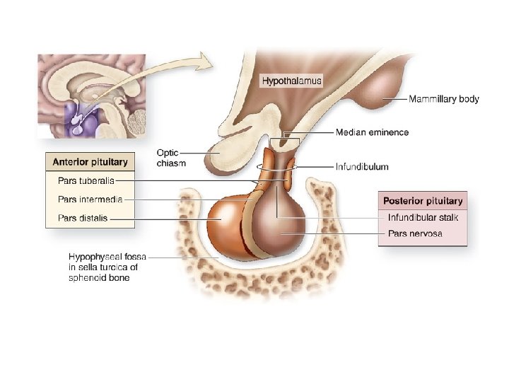 HORMONI HIPOFIZE • • Hipotalamus je glavna veza između endokrinog i nervnog sistema Hipofiza je spojena sa hipotalamusom uz pomoć infudibuluma – Anteriorni deo hipofize ili adenohipofiza – Posteriorni deo hipofize ili neurohipofiza – Između njih se nalazi pars intermedia Iz adenohipofize se oslobađaju hormoni pod uticajem oslobađajućih i inhibirajućih faktora (hormona) koje stvara hipotalmus Hipotalamusni faktori (hormoni) se stvaraju u neurosekretornim ćelijama i zatim transportuju hipotalamohipofiznim portnim sistemom