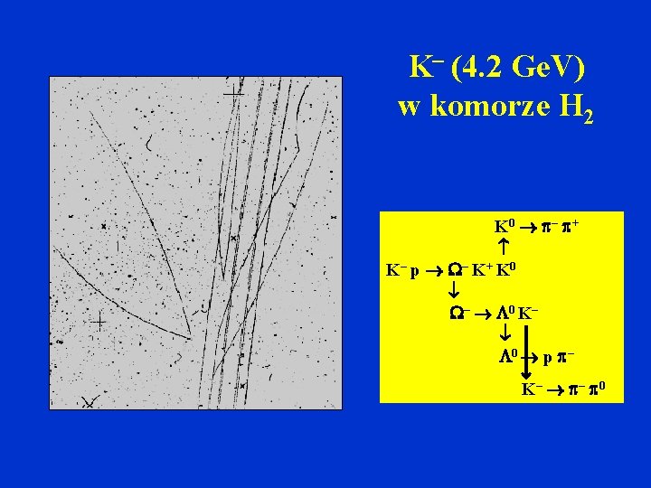 Pierwsza fotografia cząstki Vo wtórne kosmiczne, h = 0 komora mgłowa B = 0. 35 T, płytka 3’ Pb (Manchester Univ. ) Ko G. D. Rochester i C. C. Butler; Nature, 160, 855, (1947) π- m. V = 500 600 Me. V = 10 -11 10 -9 s π+ = 67 o p+ = 200 300 Me. V p - = 700 1000 Me. V