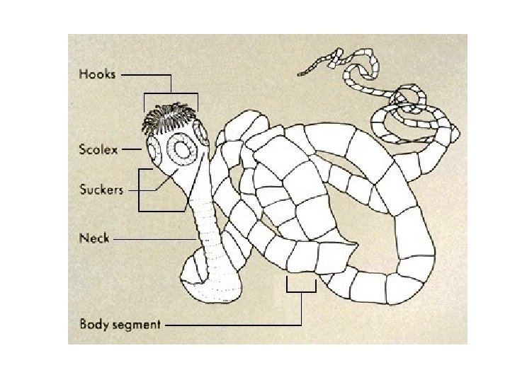 • Two body regions – Scolex – “head” • No cephalization • Hooks and suckers used to attach to inside wall of intestine – Proglottids • Body segments for reproduction