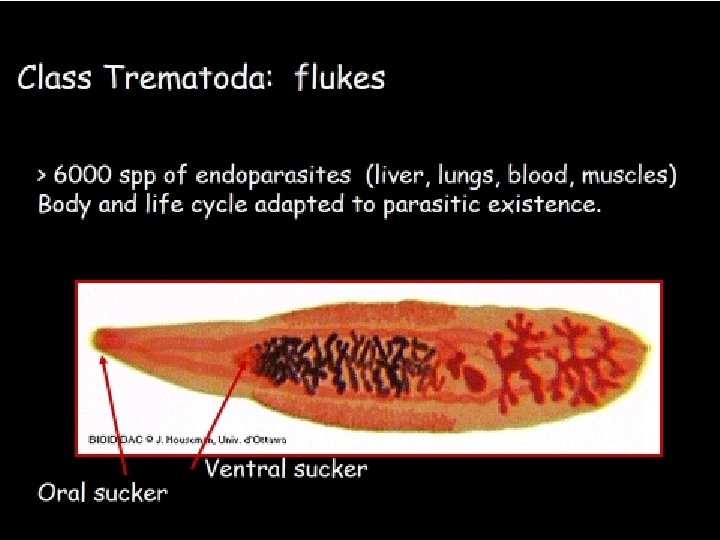 Class Trematoda • • Mostly parasitic Body: dorso-ventrally flattened leaf like Hooks and sucker are present Examples; Fasciola hepatica (Liverfluke), Diplozoon sp.