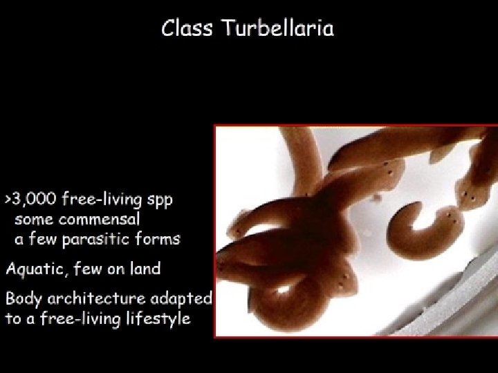 Class Turbellaria • • Mostly Free-living fresh water organism Body: dorsoventrally flattened Hooks and sucker usually absent Examples: Planaria sp. , Bipalium sp. , Otoplana sp. , Notoplana sp.