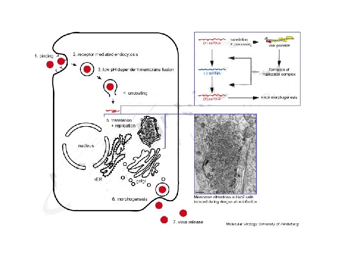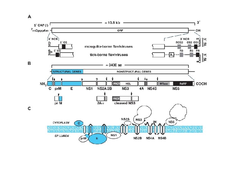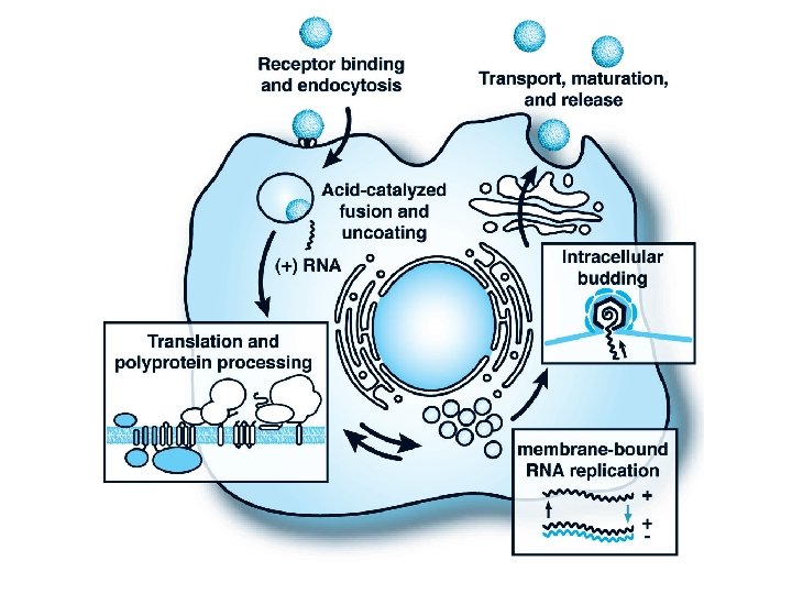 Life Cycle • Binding and uptake involve receptor-mediated endocytosis via cellular receptors specific for viral envelope proteins. • Low p. H of the endosomal pathway induces fusion of the virion envelope with cellular membranes. • Following uncoating of the nucleocapsid, the RNA genome is release into the cytoplasm. • The viral genome serves three discrete roles within the life cycle: – m. RNA for translation of all viral proteins, – template during RNA replication, and – genetic material packaged within new virus particles. • Viral proteins are produced as part of a single long polyprotein of more than 3, 000 amino acids that is cleaved by a combination of host and viral proteases. • The structural proteins are encoded in the N-terminal portion of the polyprotein with the nonstructural (NS) proteins in the remainder.