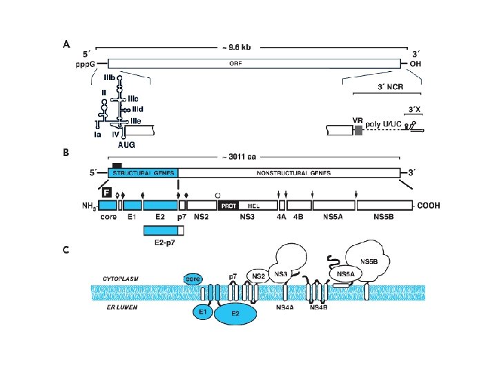 Hepatitis C Virus (HCV) • The HCV genome is an uncapped, • 9. 6 -kb RNA containing highly structured 5 and 3 ends. • The 5 NCR is a well-conserved, 341 -nt sequence element that folds into a complex structure consisting of four major domains and a pseudoknot. • The first 120 nt serves as a minimal replication element, although nearly the entire 5 NCR is needed for efficient RNA replication.