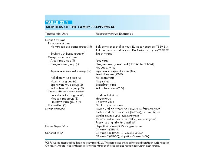 Flaviviridae • Enveloped virions made up of a lipid bilayer with two or more types of envelope (E) glycoproteins surrounding a nucleocapsid. • Single-stranded, positive-sense genome RNA complexed with multiple copies of a small, basic capsid (C) protein.