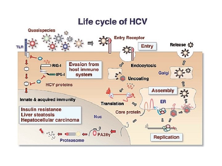 Location of Replication • The HCV genome is recruited out of translation and into a membrane associated replication complex, or replicase. • Specifically, NS proteins and HCV RNA associate with a dense perinuclear matrix of≈85 -nm vesicles termed the membranous web.