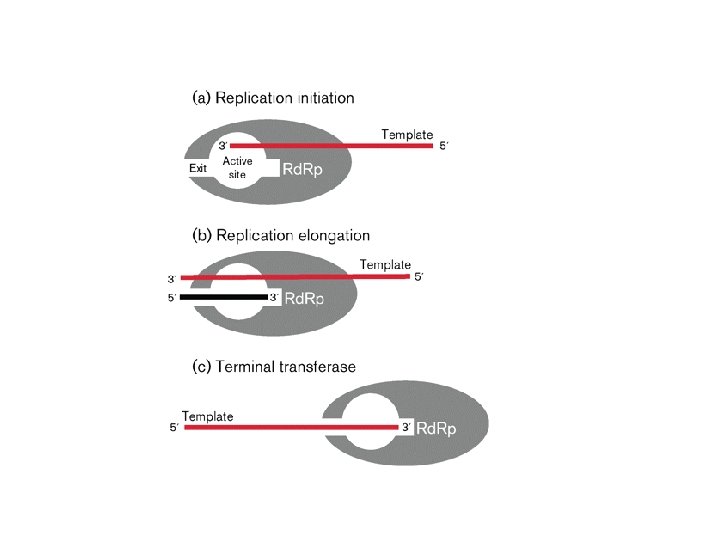 RNA Replication • Translation and RNA replication are mutually exclusive processes, because they proceed in opposite directions on a given RNA template. • Positive-strand RNA viruses regulate the rate of genome translation versus replication. • Translation of the HCV genome occurs more frequently than replication. • One way this could be regulated is via crosstalk between the determinants that control translation and genome replication. • E. g the cellular PTB protein binds to the HCV 5 NCR and core coding region where it may modulate IRES activity and to the 3 end where it may repress replication.