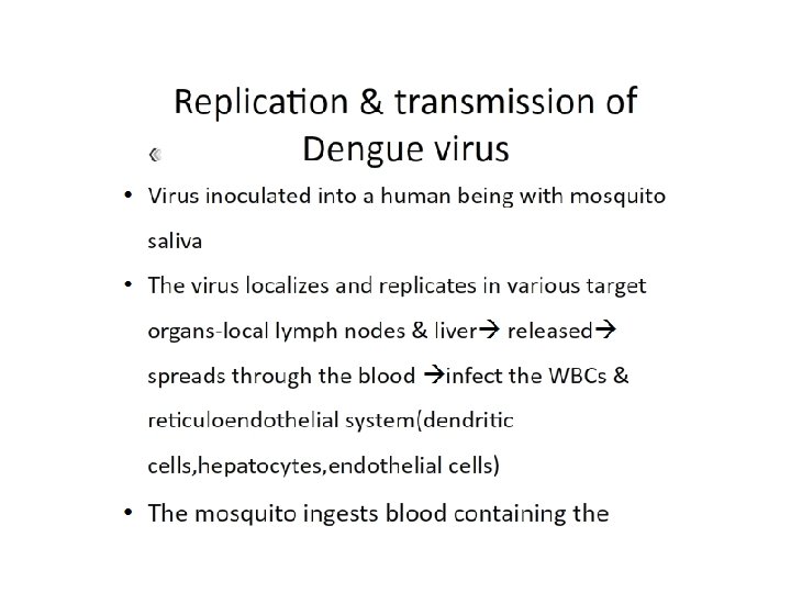 Attachment • Flaviviruses can utilize multiple receptors for different cell types and in different host species. • Infection of dendritic cells (DC) is particularly important because these intradermal cells can be primary targets early in infection. • Other proteins identified as receptors include: – αvβ 3 integrin, – GRP 78 (Bi. P), – and CD 14 • In addition, highly sulfated glycosaminoglycans (e. g. , heparan sulfate) have been shown to play an important role in the initial attachment of several flaviviruses to target cells. • Virus particles opsonized with immunoglobulins show enhanced binding and infection of cells expressing immunoglobulin Fc receptors. It is widely suspected that antibody-enhanced infection may be relevant to the pathogenesis of DF and DHF, which occur more frequently in people previously exposed to other DENV serotypes.