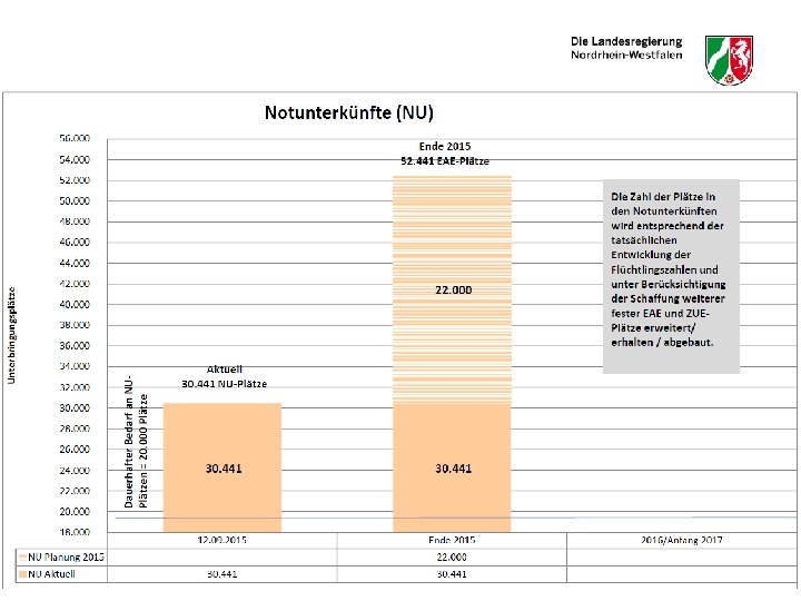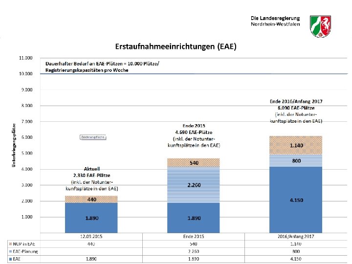 Notunterkünfte (NU) • Zurzeit werden 141 NU betrieben. • In den Notunterkünften stehen zurzeit 30. 441 Plätze zur Verfügung • Die Zahl der Plätze in den Notunterkünften wird entsprechend der tatsächlichen Entwicklung der Flüchtlingszahlen und unter Berücksichtigung der Schaffung weiterer fester EAE und ZUE-Plätze erweitert/ erhalten / abgebaut. : : : : : : : : : : : : : : : : : : : : : : : : : : : : : : : 9