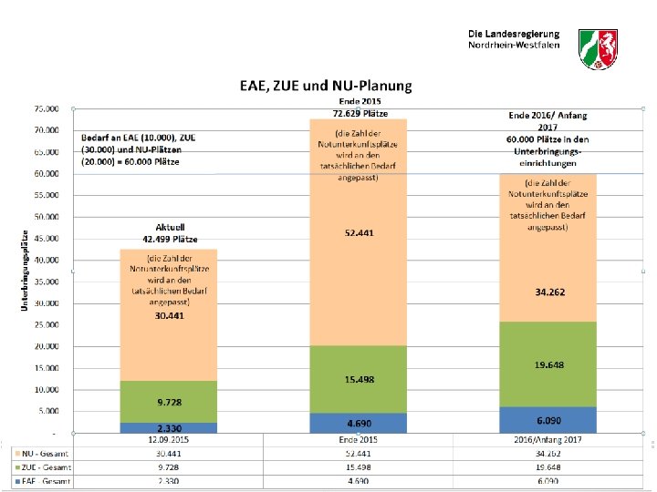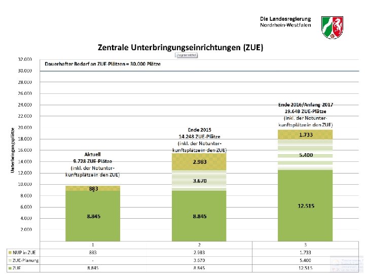 Aktuelle Entwicklung Zugang von Flüchtlingen • In den letzten Wochen gab es regelmäßige Zugänge in Höhe von 7. 000 – 7. 500 Flüchtlinge. • Aktuell haben sich diese Zahlen deutlich erhöht. In der 36. KW kamen rund 10. 100, in der 37. KW rd. 15. 400 und in der 38. KW rechnen wir mit rd. 18. 700 Flüchtlingen. • Aktuell liegt die Prognose bei bundesweit 800. 000 Flüchtlingen. • Für NRW bedeutet dies, dass rund 150. 000 Erst- und 20. 000 Folgeantragsteller erwartet werden. Hinzu kommen 50. 000 Ex-NRW-Fälle • Mittelfristig ist nicht damit zu rechnen, dass diese Zahlen deutlich zurückgehen : : : : : : : : : : : : : : : : : : : : : : : : : : : : : : : 2
