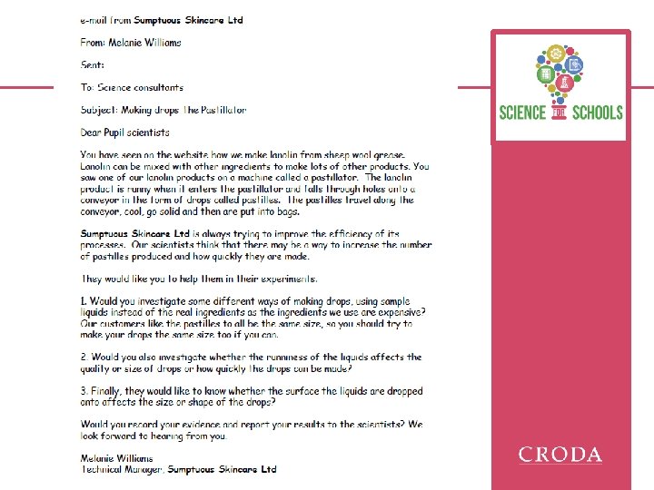 Planning We are investigating We could change… Amount of product Tool to make pastilles We will change… (independent) Our question is…. We could measure/observe… Time to make pastilles ? How many pastilles are made We will measure/observe (dependent) ? How well can we make pastilles? We will keep the same ? How even the pastilles are