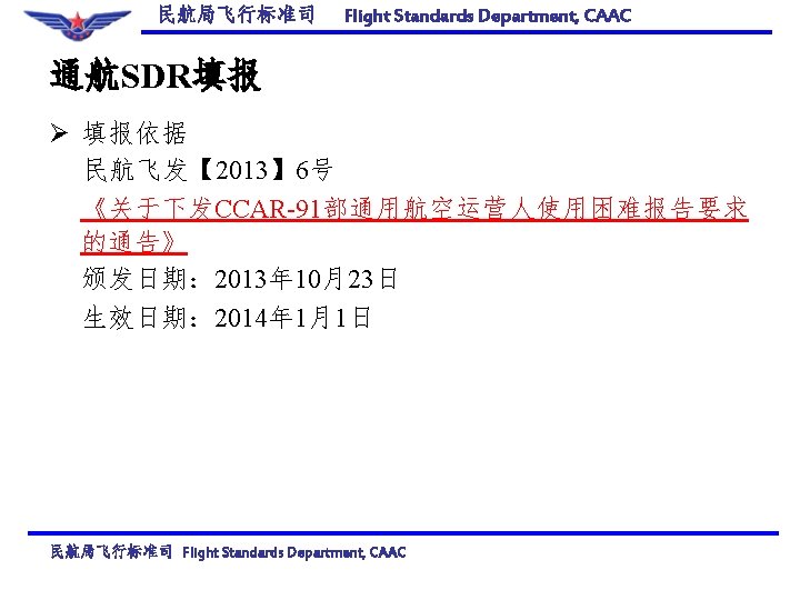 Flight Standards Department CAAC 2021 1021 Flight Standards Slides: 30 Download presentation 民航局飞行标准司 Flight Standards Department, CAAC 通航机载设备符合性方法报备培训 2021年 10月21日 民航局飞行标准司 Flight Standards Department, CAAC 民航局飞行标准司 Flight Standards Department, CAAC Ø 通航SDR填报情况 Ø 通航机载设备符合性方法报备 民航局飞行标准司 Flight Standards Department, CAAC 民航局飞行标准司 Flight Standards Department, CAAC Ø 通航SDR填报情况 Ø 通航机载设备符合性方法报备 民航局飞行标准司 Flight Standards Department, CAAC 民航局飞行标准司 Flight Standards Department, CAAC 通航机载设备符合性方法报备 Ø 报备填报 民航局飞行标准司 Flight Standards Department, CAAC 民航局飞行标准司 Flight Standards Department, CAAC 建议和意见? 民航局飞行标准司 Flight Standards Department, CAAC 民航局飞行标准司 Flight Standards Department, CAAC 谢谢! 民航局飞行标准司 Flight Standards Department, CAAC