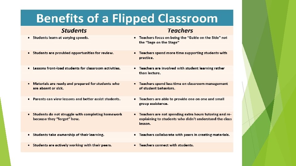 The Cons There is significant work on the front-end Additionally, there is a concern that implementing a Flipped classroom adds an extra workload on teachers, as there are several elements that must be integrated carefully to allow the class to flourish. Responsibilities include taping and uploading condensed lectures, which take time and skill, and introducing activities in the classroom that will enhance the subject matter as well as motivate sts to participate and prepare for class. Though teachers can gradually integrated flipped elements into their classrooms, it will still require additional time and effort from teachers.