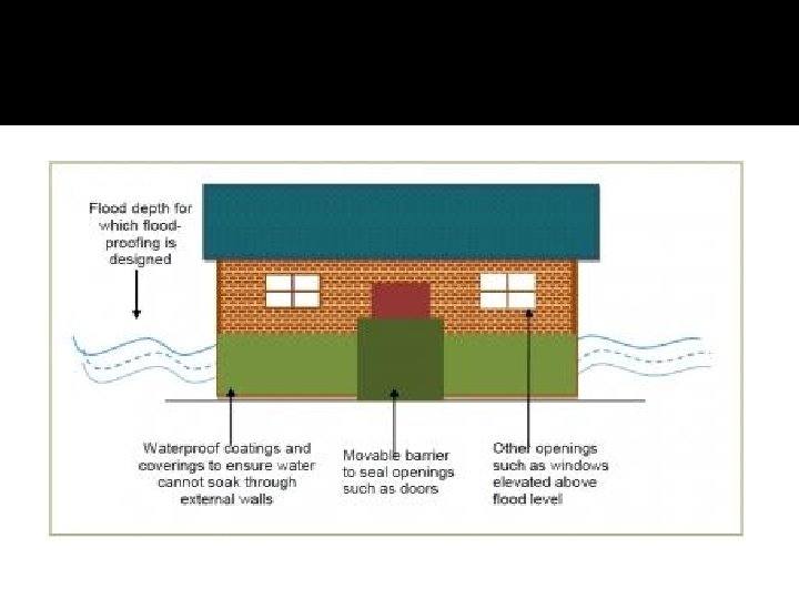 Flood Proofing �Flood proofing measures help greatly in the mitigation of distress and provide immediate relief to the population in flood prone areas. � It is essentially a combination of structural change and emergency action, not involving any evacuation. �The techniques adopted consist of providing raised platforms for flood shelter for men and cattle, raising the public utility installation especially the platforms for drinking water hand pumps and bore wells above flood level
