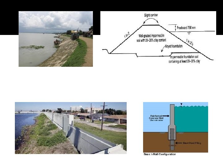 Structural Measures 1. Embankments/Banks, Flood Walls, Flood Levees(may be natural leeve) ØThe embankment system in the river restricts the river to its existing course and prevents it from overflowing the banks. ØEmbankments are constructed generally with earth easily available from nearby areas. ØIn developed areas where adequate space is not available or land is very expensive, concrete or masonry floodwalls are constructed.